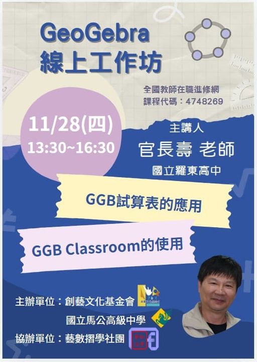 創藝文化基金會 ×馬公高中×藝數摺學 線上教師研習工作坊,11/1正式開放報名! 提醒參加研習的老師兩件事: 1.在自己電腦事先下載安裝GeoGebra 經典6版 2.到GeoGebra 官網首頁,註冊建立一個GeoGebra 帳號